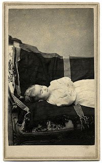 Robert respectfully declined John’s request to stand next to the casket and cast a mournful eye down upon its contents. He didn’t quite understand memento mori. Images of death haunted his dreams at night and he didn’t need such reminders during the day. When Robert was child, Abigail DeWitt, the young girl and occasional playmate who lived next door, died at the tender age of seven, the victim of typhoid fever. Robert watched from an outside window as the family made preparations for her funeral. A post mortem photographer was hired and Abigail’s little body was made to sit on her favorite wooden horse through the use of hidden stands and wires. Watching the man work on young Abigail’s remains reminded Robert of a puppeteer. After she was posed properly on her horse, pupils were painted on her closed eyelids giving her the appearance of life. Her parents then sat next to her in solemnity as the photographer took their picture.---from Lilac Wine, Chapter 23